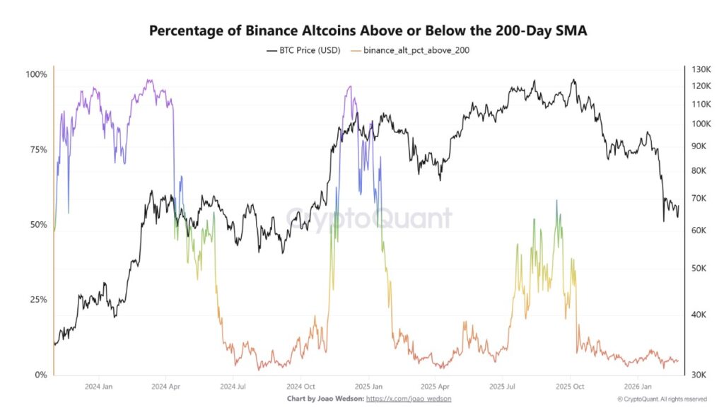 Data dari CryptoQuant menunjukkan bahwa hanya sekitar 5% altcoin yang terdaftar di Binance diperdagangkan di atas simple moving average 200 hari (SMA 200 hari). Artinya, 95% sisanya masih berada di bawah level tersebut, yang mencerminkan kinerja altcoin yang saat ini masih lemah.