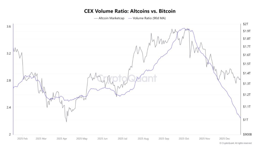 Untuk melihat gambaran yang lebih seimbang, data dari CryptoQuant menunjukkan bahwa rasio volume perdagangan altcoin terhadap volume perdagangan Bitcoin di bursa terpusat (CEX) turun ke level terendah dalam setahun terakhir.