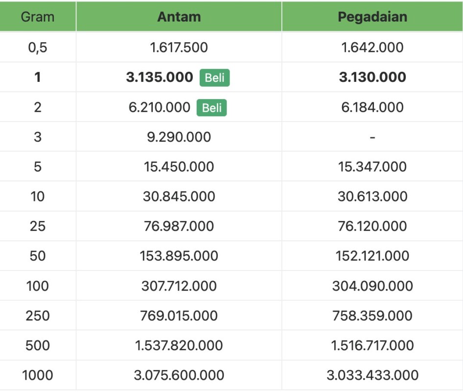 Jakarta, Pintu News – Harga emas 99 hari ini atau emas kadar 99,9% (24 karat) kembali diperbarui pada 2 Maret 2026. Berdasarkan data terbaru, harga emas Antam 1 gram berada di level Rp3.135.000, sementara versi Pegadaian tercatat Rp3.130.000. Pergerakan harga ini mengikuti dinamika emas global dan kurs rupiah terhadap dolar AS, yang juga memengaruhi keputusan diversifikasi aset seperti crypto dan cryptocurrency.