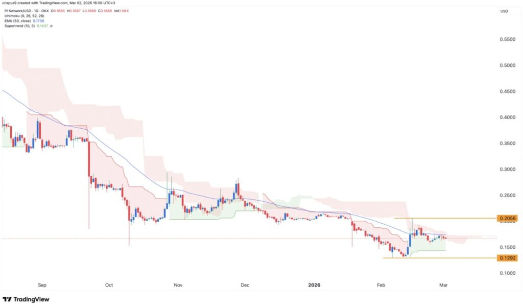 Jakarta, Pintu News – Harga Pi Coin mencatat kenaikan tipis pada Februari ketika Bitcoin dan mayoritas altcoin melemah. Setelah turun ke level terendah sepanjang masa di $0.1300 pada Februari, token ini memantul sekitar 60% hingga menyentuh puncak $0.2056.