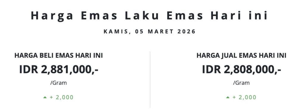 Pada Kamus, 5 Maret 2026, harga emas di Laku Emas tercatat menguat. Harga beli emas berada di level IDR 2.881.000 per gram, sedangkan harga jual berada di IDR 2.808.000 per gram. Dibandingkan periode sebelumnya, keduanya sama-sama mengalami kenaikan sebesar IDR 2.000 per gram, yang menunjukkan adanya penguatan harga di sisi transaksi beli maupun jual pada hari ini.