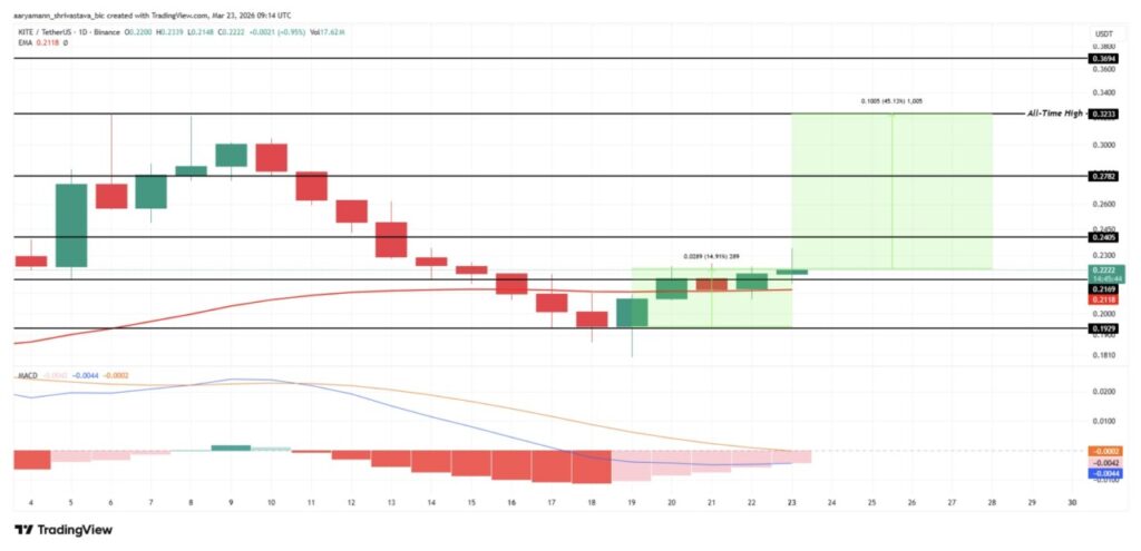 Pada 23 Maret 2026, harga Kite sempat berada di $0.2222, naik 0,95% dalam sehari. Pergerakannya masih bertahan sedikit di atas EMA yang berada di $0.2118, setelah sebelumnya terkoreksi dari all-time high pada 6 Maret di level $0.3233. Konsolidasi harga di kisaran $0.2169 hingga $0.2405 sudah berlangsung hampir dua minggu tanpa breakdown ke bawah, yang dapat dianggap sebagai sinyal positif.