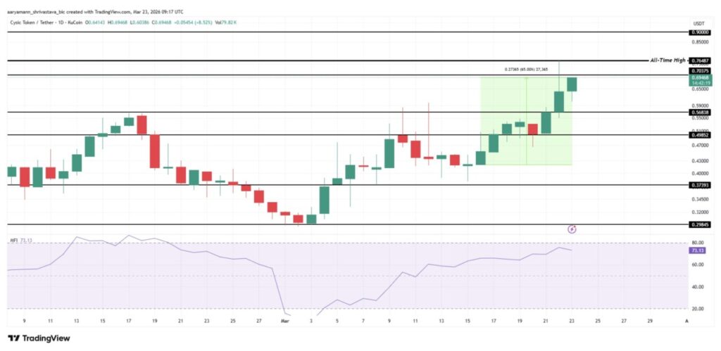 Pada 23 Maret 2026, Cysic (CYS) sempat diperdagangkan di $0.694, naik 8,52% dalam sehari, setelah melonjak sekitar 60% dari kisaran $0.429 pada 16 Maret. All-time high di $0.764 kini hanya berjarak sekitar 10,1% dari harga saat ini, menjadi selisih terkecil sejak token ini pertama kali listing.