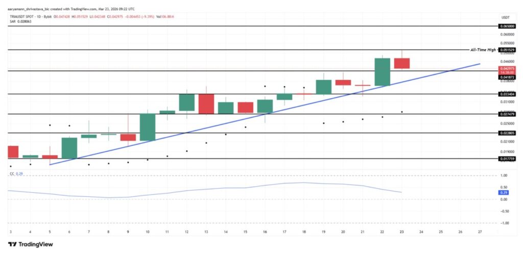 Tria (TRIA) sempat mencetak all-time high baru di $0.0515 sebelum kemudian terkoreksi 9,39% ke $0.0429 pada hari yang sama. Altcoin ini naik dari sekitar $0.0230 pada 9 Maret ke puncak barunya hanya dalam waktu dua minggu, atau menguat sekitar 124% dalam 14 hari.