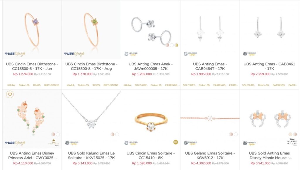 Koleksi emas UBS perhiasan menampilkan variasi produk yang cukup luas, mulai dari cincin, anting, kalung, hingga gelang dengan kadar emas dominan 17K serta beberapa varian 8K.