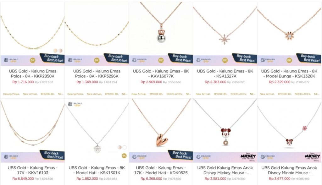 UBS Gold menawarkan berbagai pilihan kalung emas dengan kadar 8K hingga 17K yang hadir dalam beragam desain, mulai dari model polos hingga motif dekoratif seperti bunga, hati, dan karakter Disney.