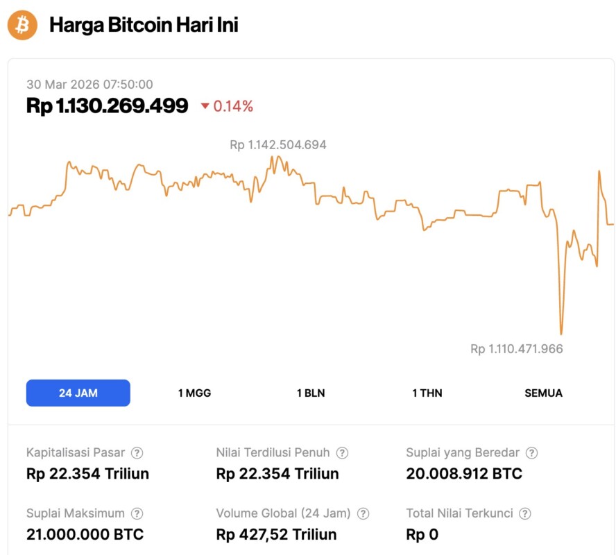 Pada 30 Maret 2026, harga Bitcoin tercatat berada di level $66,177 atau setara dengan Rp1.130.269.499, mengalami koreksi tipis 0,14% dalam 24 jam terakhir. Sepanjang periode ini, BTC menyentuh level terendahnya di Rp1.110.471.966 dan harga tertingginya di Rp1.142.504.694.