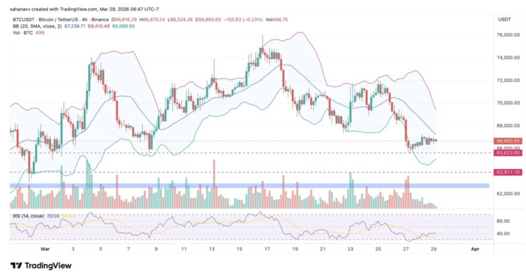 Per 29 Maret, Bitcoin sempat diperdagangkan di sekitar level $66.600 dan masih bergerak dalam rentang sempit setelah beberapa kali gagal menembus area $70.000–$72.000. Grafik 4 jam menunjukkan belum adanya momentum arah yang kuat, dengan kecenderungan pergerakan jangka pendek yang sedikit bearish.