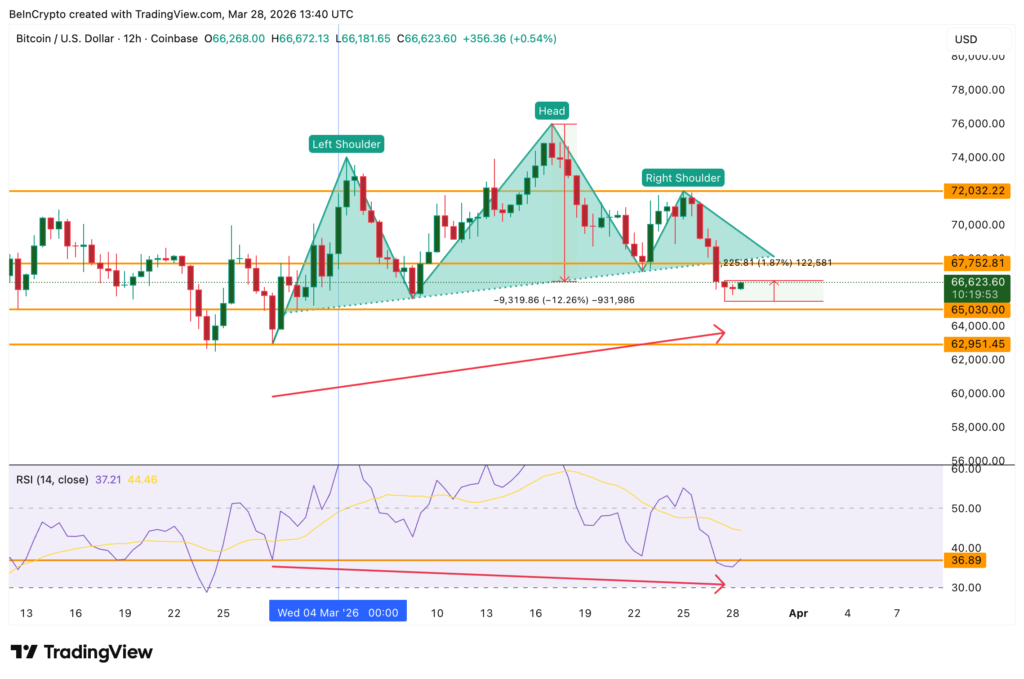 Pada grafik 12 jam, pola head and shoulders yang terbentuk sejak akhir Februari menjadi perhatian utama para analis. Garis leher (neckline) dari pola ini berada di sekitar $67.700, dan konfirmasi breakdown terjadi pada 27 Maret.