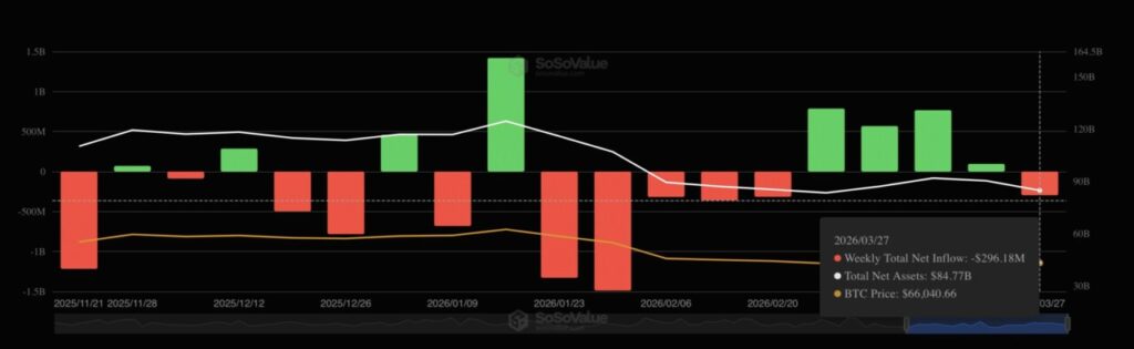 Sentimen institusional juga mulai melemah, terlihat dari arus keluar dana (outflow) ETF Bitcoin spot. Dalam satu minggu, sekitar $296 juta atau Rp5,02 triliun keluar dari ETF.