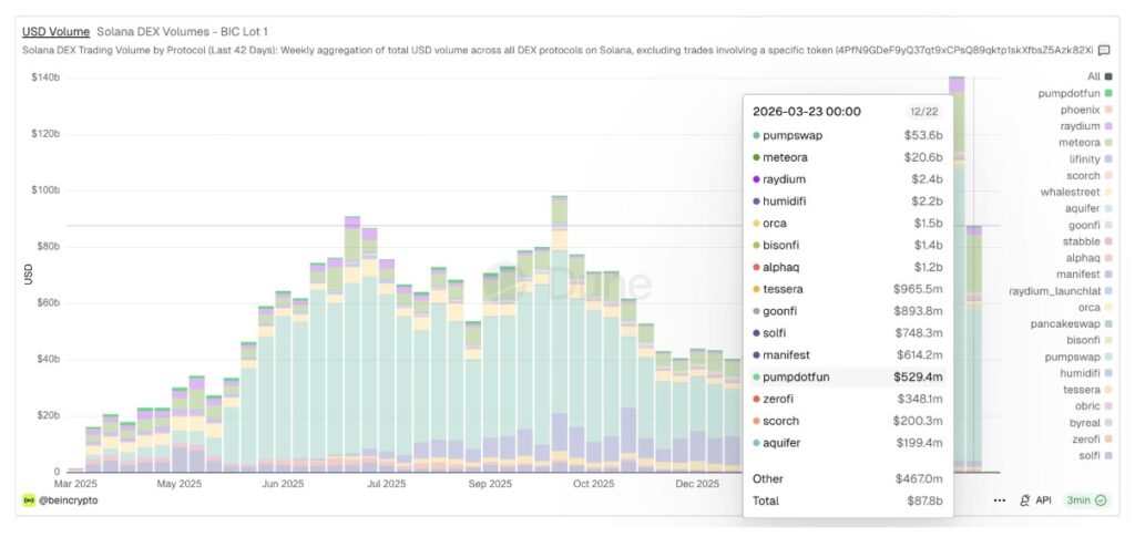 Bonk (BONK) memasuki April sebagai salah satu meme coin Solana (SOL) dengan struktur yang relatif lebih positif. Kondisi pendukungnya juga cukup kuat. Volume DEX mingguan Solana tercatat pulih dari kisaran terendah sekitar $40,5 miliar pada pertengahan Agustus 2025 menjadi $87,8 miliar pada pekan yang berakhir 23 Maret 2026.