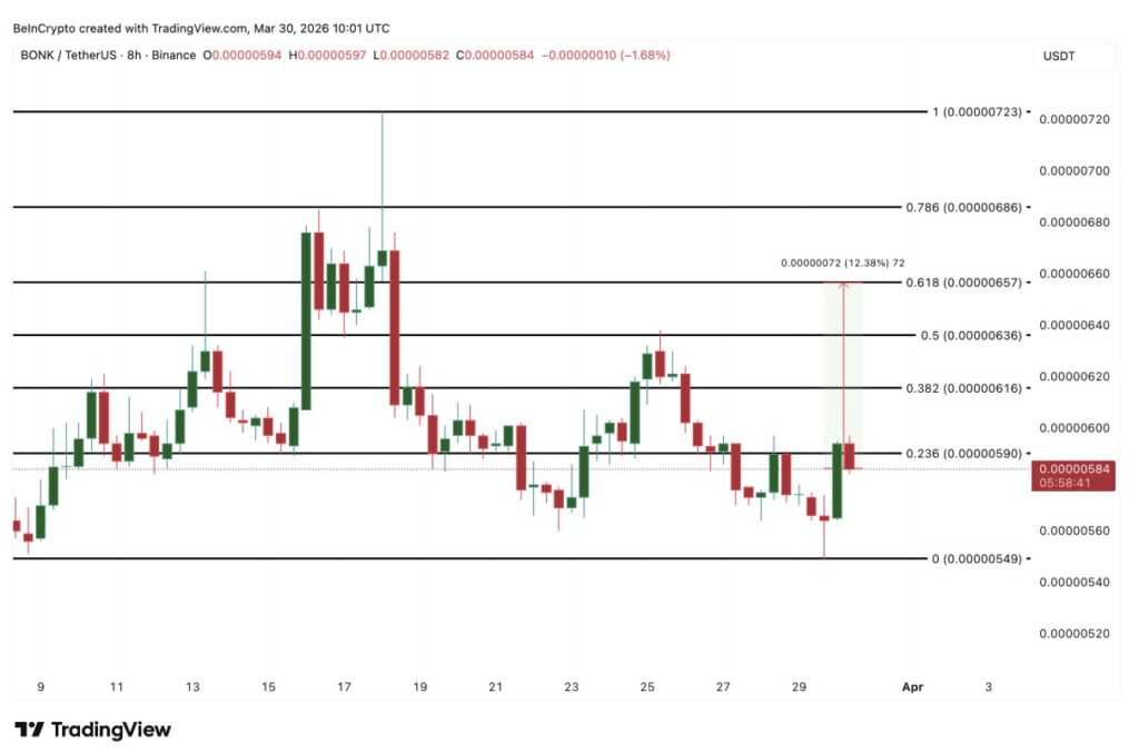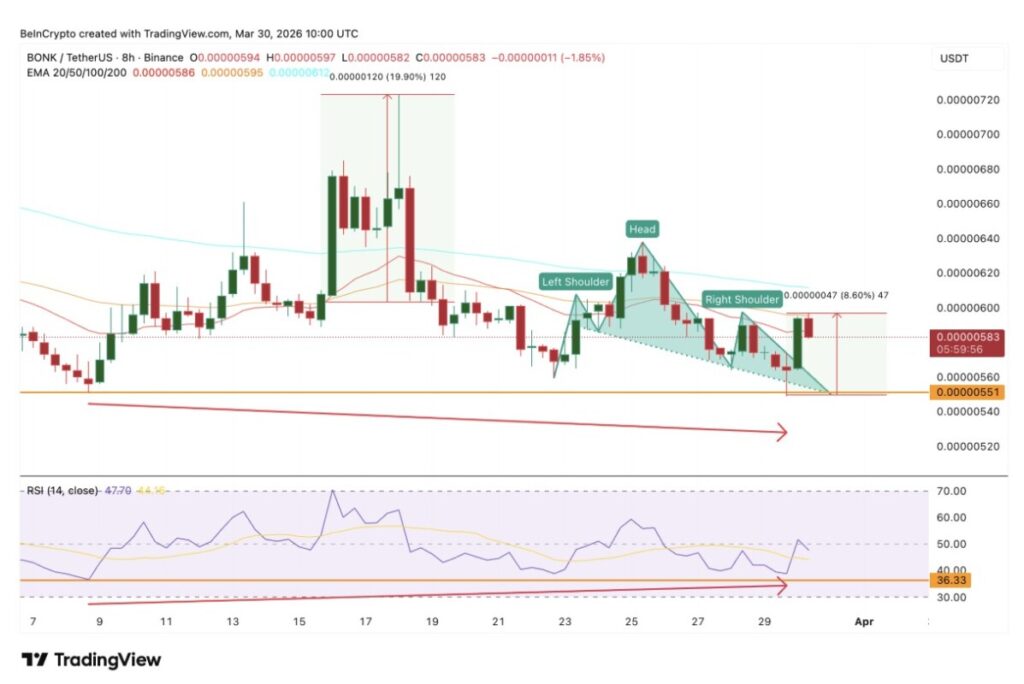 Pada grafik 8 jam (30/3), BONK baru-baru ini berhasil menghindari breakdown pola head and shoulders. Area neckline tetap bertahan, dan token ini memantul sekitar 8,6% dari titik terendah bahu kanan.