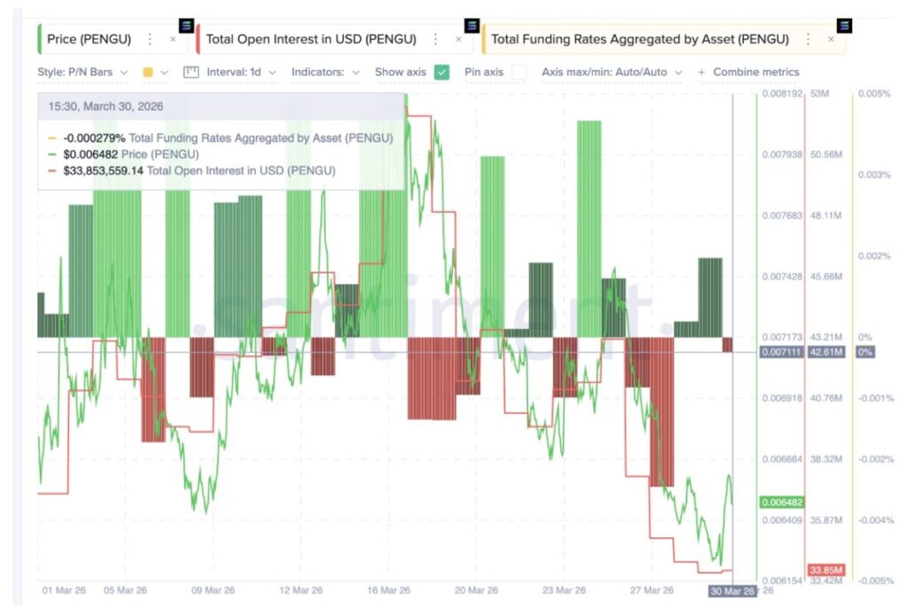 Pudgy Penguins (PENGU) telah menjadi salah satu aset yang cukup lama trending di CoinGecko. Namun, data derivatif menjelang April menunjukkan gambaran yang lebih hati-hati untuk meme coin ini. Open interest turun dari $43,8 juta pada 25 Maret menjadi $33,85 juta per 30 Maret, atau merosot 23% hanya dalam lima hari.