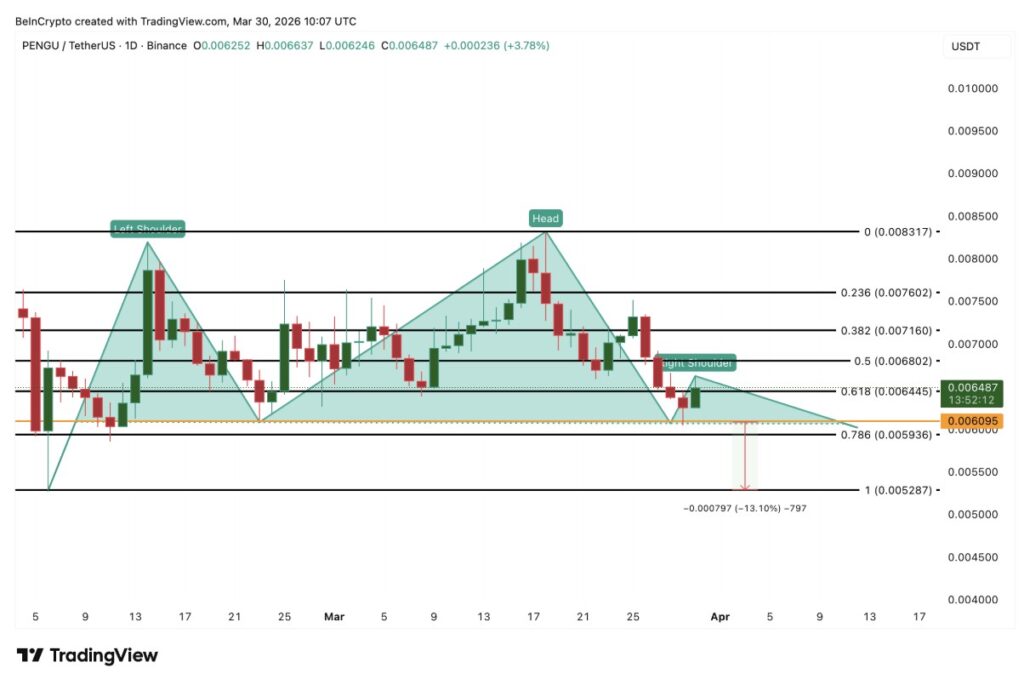 Dari sisi grafik harian (30/3), kondisi ini menambah alasan untuk waspada. PENGU sedang membentuk pola head and shoulders, dengan area neckline di sekitar $0.0060. Bagian head mencapai puncak di sekitar $0.0083, sementara bahu kanan masih dalam proses pembentukan.
