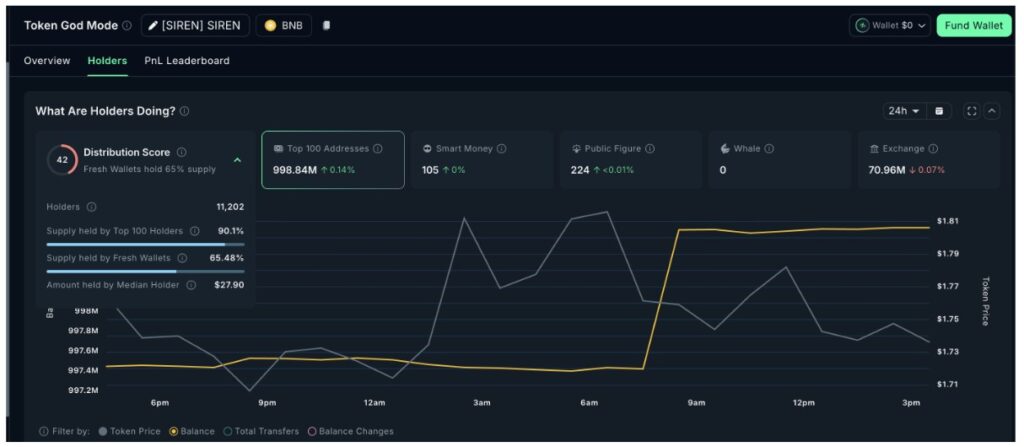Kondisi tenang ini menjadi semakin menarik ketika dikaitkan dengan konsentrasi kepemilikan whale pada SIREN. Sebanyak 100 alamat wallet teratas menguasai 90,1% dari total suplai, dan dalam 24 jam terakhir tidak terlihat pergerakan berarti baik dari wallet para holder terbesar maupun dari saldo token di bursa.