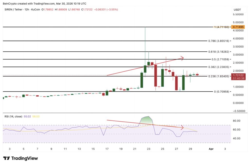 Pada grafik 12 jam, mulai terbentuk bearish divergence yang mengindikasikan potensi pemicu pergerakan dalam beberapa hari ke depan. Dalam periode 17 Maret hingga 28 Maret, harga SIREN mencetak higher high, sedangkan RSI justru membentuk lower high.