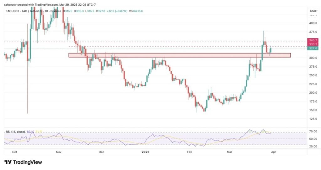 Jika TAO berhasil mengubah level $333 menjadi support, target kenaikan berikutnya berada di sekitar $350. Namun, apabila harga gagal bertahan di atas zona resistance tersebut, TAO berisiko mengalami koreksi jangka pendek menuju area support $300–$310.