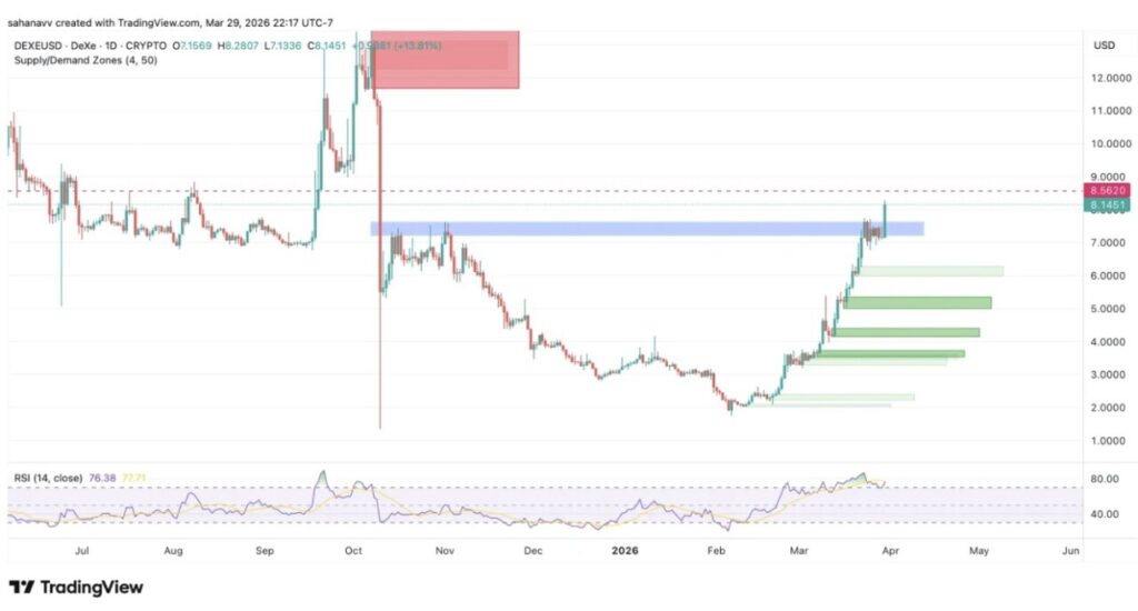 Harga DeXe (DEXE) mencatat pemulihan parabolis yang cukup kuat setelah kembali menembus zona resistance utama di sekitar $7,5, yang sebelumnya membatasi reli pada kuartal keempat 2025.