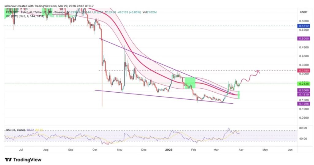 Saat ini, FET sedang berupaya merebut kembali zona resistance $0,24–$0,25, yang bertepatan dengan area suplai penting sekaligus garis tren menurun. Jika berhasil menembus area ini, FET berpotensi melanjutkan kenaikan menuju $0,30–$0,32 sebagai zona resistance utama berikutnya. Sementara itu, RSI bergerak naik dan bertahan di atas garis tengah, yang menandakan penguatan momentum bullish.