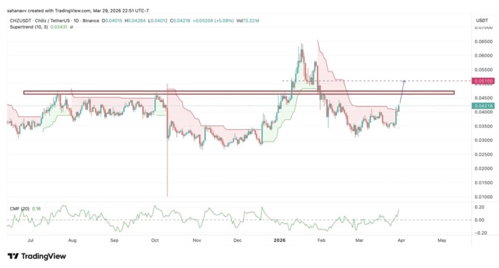 Jika CHZ mampu menembus dan bertahan di atas zona resistance $0,047, maka harga berpotensi melanjutkan kenaikan menuju $0,050–$0,052 dalam jangka pendek.