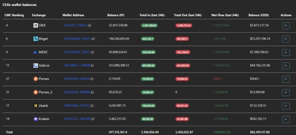 Selama periode tersebut, arus masuk bersih tercatat sebesar 904.833 token Pi. Kenaikan saldo di Gate.io dan Bitget terlihat cukup signifikan, sementara Kraken dan OKX juga membukukan arus positif. Statistik ini menunjukkan bahwa likuiditas Pi di bursa sedang meningkat.