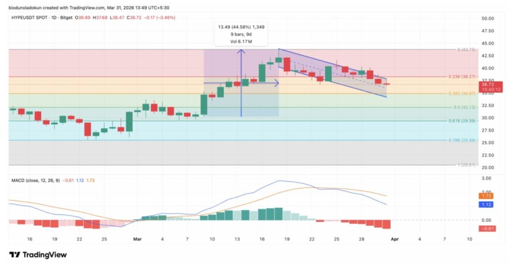 Jika tekanan jual semakin kuat sepanjang April, HYPE berpotensi turun ke level $34,87.