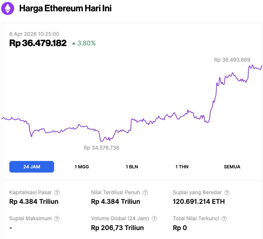 Pada 6 April 2026, harga Ethereum tercatat berada di sekitar $2,134 atau setara dengan Rp36.479.182, mengalami kenaikan 3,80% dalam 24 jam terakhir. Sepanjang periode ini, ETH sempat menyentuh level terendahnya di Rp34.576.736 dan level tertingginya di Rp36.493.669.
