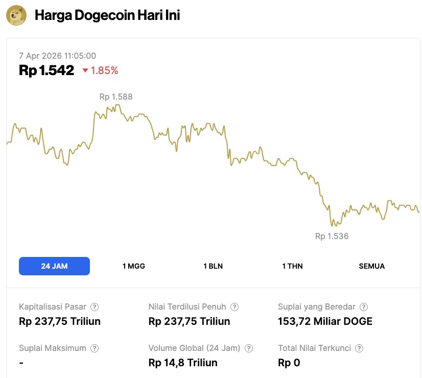 Pada 7 April 2026, harga Dogecoin tercatat mengalami penurunan 1,85% dalam waktu 24 jam, diperdagangkan pada harga $0.09049 atau setara dengan Rp1.542. Dalam periode 24 jam terakhir, harga DOGE bergerak dalam kisaran Rp1.588 hingga ke Rp1.536.