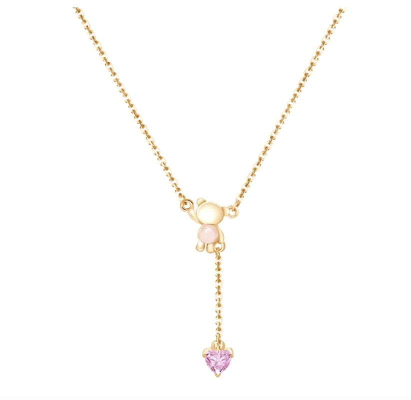 Harga kalung emas “Bear with Pink Heart” pada laman The Palace dibanderol sekitar Rp3.693.601. Berdasarkan informasi, produk ini menggunakan material yellow gold serta memiliki kadar emas 9 karat.