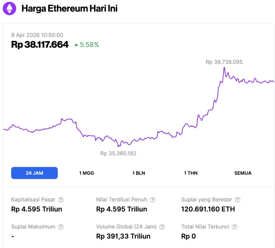Pada 8 April 2026, harga Ethereum tercatat berada di sekitar $2,233 atau setara dengan Rp38.117.664, mengalami kenaikan 5,58% dalam 24 jam terakhir. Sepanjang periode ini, ETH sempat menyentuh level terendahnya di Rp35.360.182 dan level tertingginya di Rp38.738.095.