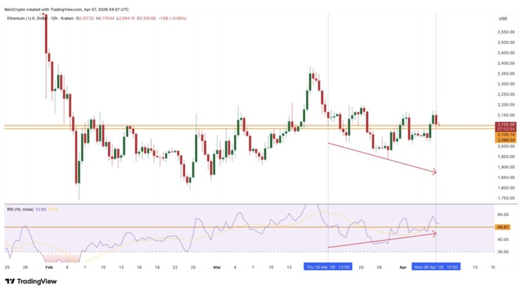 Metrik kedua adalah Relative Strength Index (RSI), yakni osilator momentum. Dalam periode 19 Maret hingga 6 April, harga membentuk lower low pada grafik 12 jam, sementara RSI justru mencetak higher low.