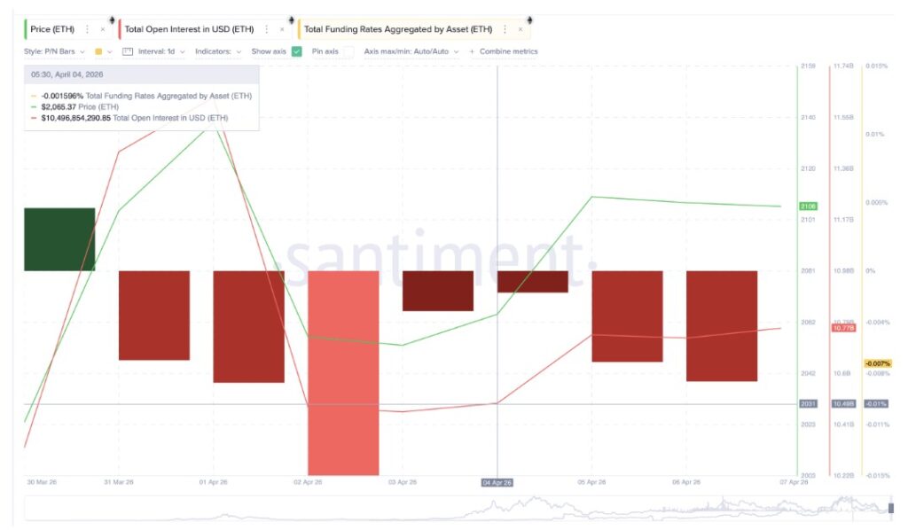 Metrik ketiga berasal dari pasar derivatif. Pada 4 April, total open interest Ethereum tercatat sebesar $10.49 miliar dengan funding rate sekitar -0.0015%. Lalu pada 7 April, open interest naik menjadi $10.77 miliar, sementara funding rate turun lebih dalam ke -0.007%.