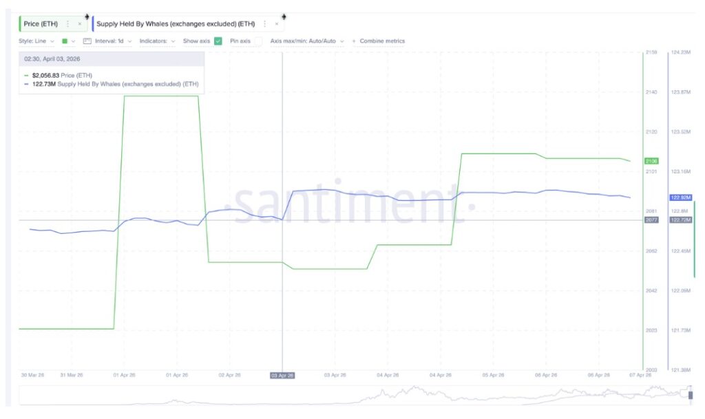 Metrik keempat berkaitan dengan perilaku whale. Sejak 3 April, wallet whale non-exchange tercatat meningkatkan kepemilikan mereka dari 122.73 juta menjadi 122.92 juta ETH. Kenaikan sekitar 190,000 ETH, atau kurang lebih setara $400 juta, mencerminkan akumulasi yang berlangsung stabil, bukan aksi beli agresif dalam waktu singkat.