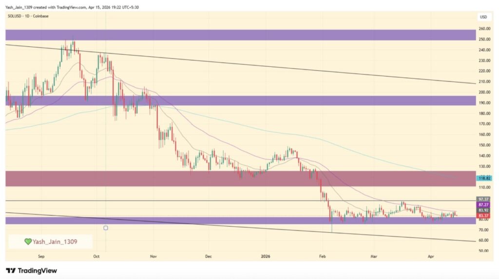 Saat ini, harga Solana terjebak di antara dua klaster likuidasi utama, yakni di level $78 pada sisi bawah dan $95 pada sisi atas. Kondisi ini mencerminkan pola kompresi klasik.