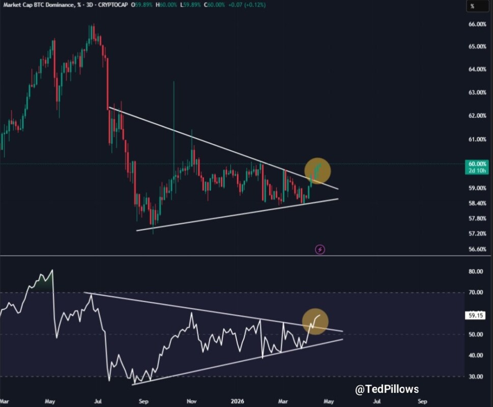 Analis teknis menyebutkan bahwa breakout pada dominasi Bitcoin (BTC) menandakan aliran modal mulai kembali terpusat pada aset cryptocurrency utama karena investor mencari keamanan di tengah ketidakpastian global. Jika tren ini berlanjut bersamaan dengan aksi beli masif dari Michael Saylor, harga BTC berpotensi mendapatkan momentum dorongan ke atas yang signifikan. Kamu perlu memperhatikan bahwa dalam skenario seperti ini, selera risiko investor biasanya berkurang pada altcoins dan beralih sepenuhnya pada kekuatan Bitcoin (BTC).