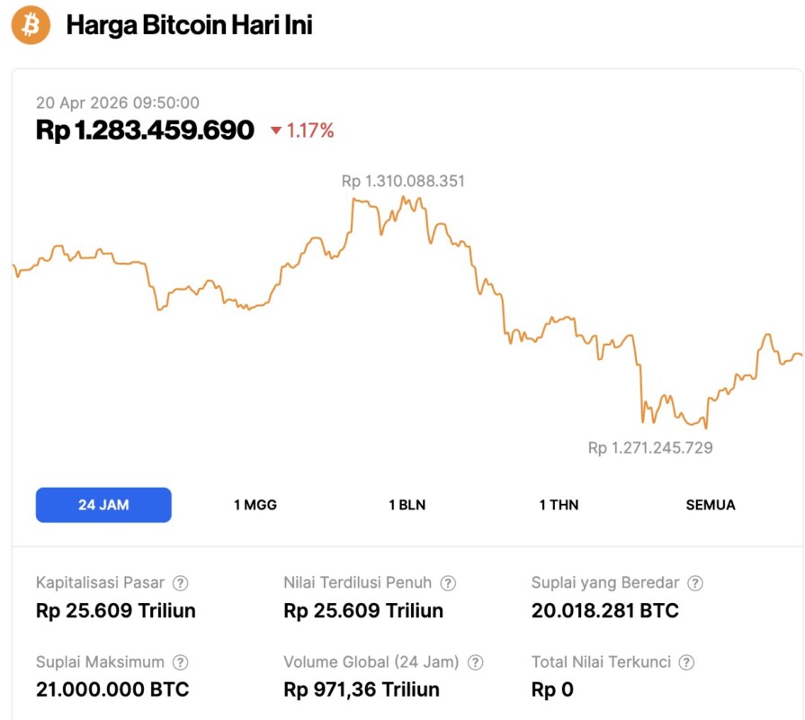 Pada 20 April 2026, harga Bitcoin tercatat berada di level $74,482 atau setara dengan Rp1.283.459.690, mengalami penurunan 1,17% dalam 24 jam terakhir. Sepanjang periode ini, BTC menyentuh level terendahnya di Rp1.271.245.729 dan harga tertingginya di Rp1.310.088.351.