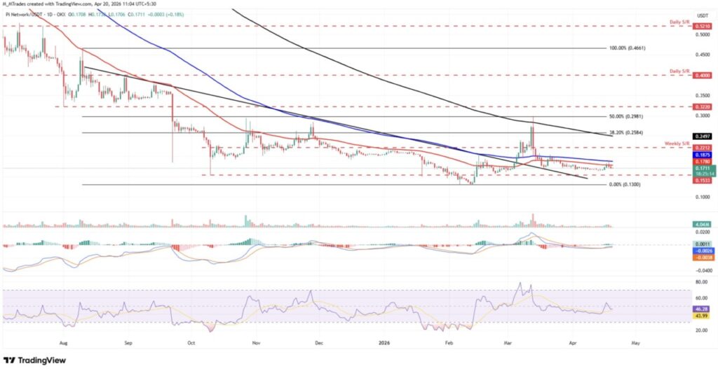Jakarta, Pintu News – Pi Network (PI) diperdagangkan pada $0,171 pada hari Senin (20/4) setelah mendapat penolakan (rejection) pada Exponential Moving Average (EMA) 50-hari di dekat $0,178 dan ditutup di bawah level tersebut pada hari Minggu, yang menandakan melemahnya momentum bullish.