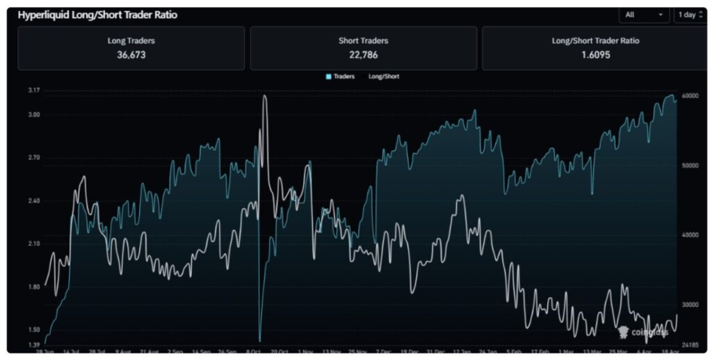 Data derivatif menunjukkan rasio long/short sebesar 1,60, dengan sekitar 36.673 trader long berbanding 22.786 trader short. Hal ini mengindikasikan bias bullish yang sangat jelas dalam penempatan posisi.