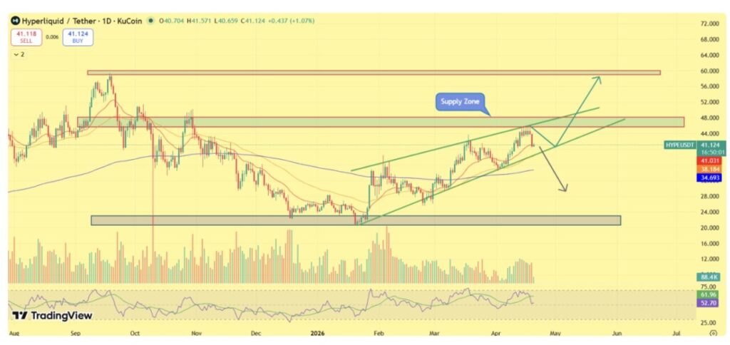 Harga HYPE saat ini diperdagangkan di sekitar kisaran $40–$41, berada tepat di atas dukungan garis tren yang menanjak (rising trendline support). Garis tren ini telah bertindak sebagai zona akumulasi dinamis selama beberapa minggu terakhir, di mana para pembeli secara konsisten masuk saat harga turun.