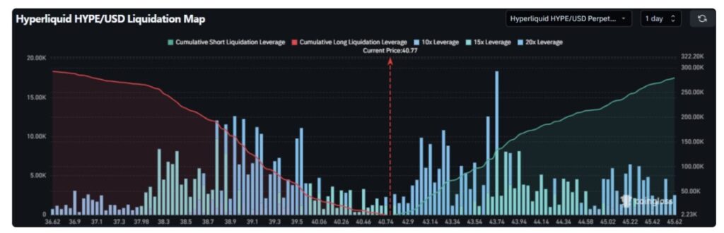 Di sisi atas, likuiditas terkonsentrasi di atas $45 dan membentang menuju $50, di mana posisi short dan penjual yang terjebak dapat terlikuidasi jika harga mengalami breakout. Hal ini menciptakan efek magnet likuiditas, yang akan menarik harga menuju zona tersebut jika terjadi penguatan.