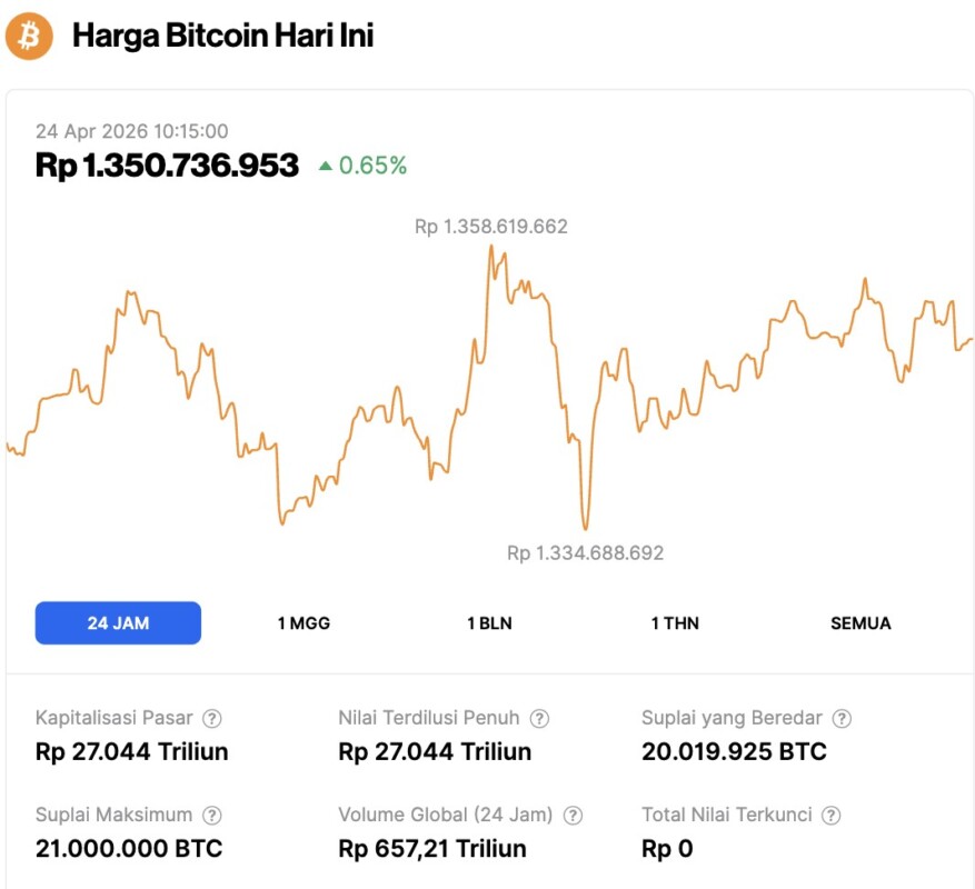 Pada 24 April 2026, harga Bitcoin tercatat berada di level $78,080 atau setara dengan Rp1.350.736.953, mengalami kenaikan 0,65% dalam 24 jam terakhir. Sepanjang periode ini, BTC menyentuh level terendahnya di Rp1.358.619.662 dan harga tertingginya di Rp1.334.688.692.