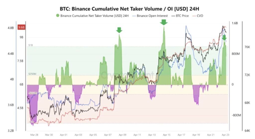 Data aliran pesanan (order flow) memberikan gambaran yang lebih jelas mengenai perilaku pasar saat ini. Volume net taker Binance yang melampaui $1 miliar dalam beberapa kesempatan menunjukkan bahwa pembeli mengeksekusi pesanan pada harga pasar (at market) alih-alih menunggu terjadinya koreksi (retracements). Jenis aktivitas seperti ini biasanya dikaitkan dengan partisipasi pasar yang didorong oleh keyakinan yang kuat.