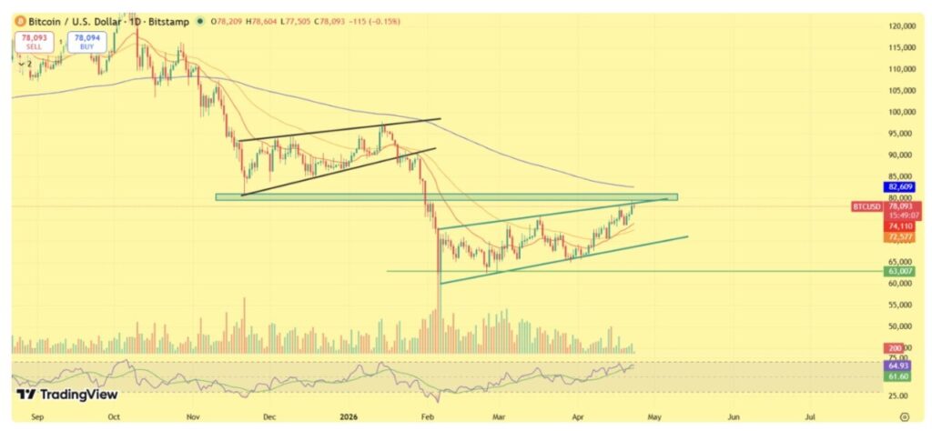 Struktur Bitcoin saat ini ditentukan oleh kompresi (pemadatan) di bawah pita resisten utama. Setelah membentuk basis di dekat $63.000, harga telah membentuk serangkaian level terendah yang semakin tinggi (higher lows), secara bertahap mendorong ke arah zona $80.000–$82.000. Perilaku ini mencerminkan kekuatan yang terkendali.