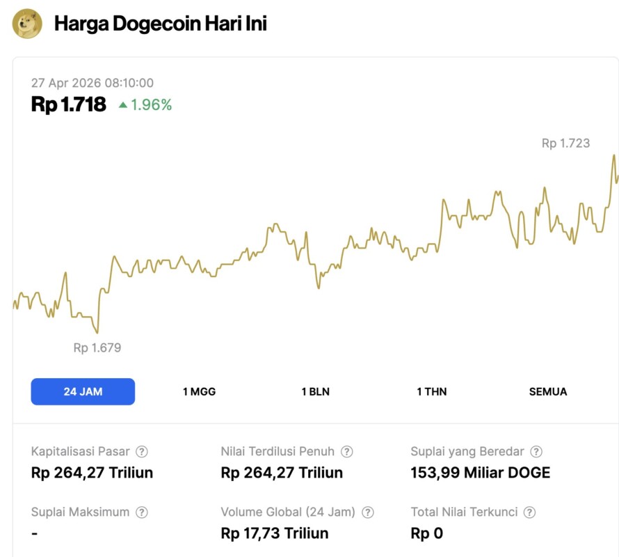 Pada 27 April 2026, harga Dogecoin tercatat mengalami kenaikan 1,96% dalam waktu 24 jam, diperdagangkan pada harga $0.1000 atau setara dengan Rp1.718. Dalam periode 24 jam terakhir, harga DOGE bergerak dalam kisaran Rp1.679 hingga ke Rp1.723.