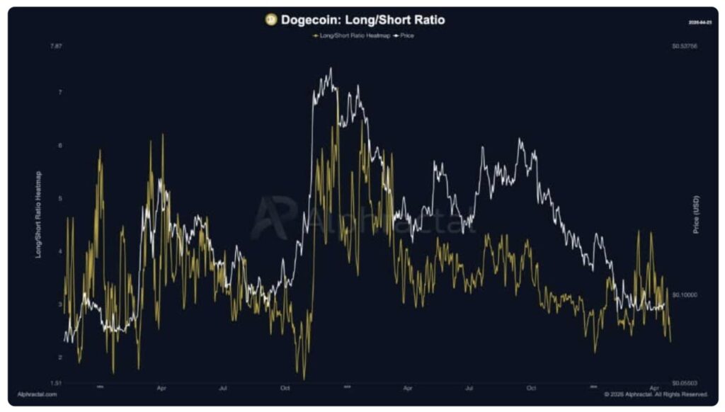Per 26 April, rasio Dogecoin berada di angka 2,6, menunjukkan bahwa posisi long jauh mengungguli posisi short. Hal ini mengisyaratkan adanya taruhan bullish yang agresif dalam jangka pendek, meskipun indikator permintaan yang lebih luas melemah secara menyeluruh.