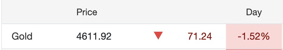 Koreksi ini menekan harga emas hingga berada di level 4.611,92. Indikator panah merah yang mengarah ke bawah, beserta blok persentase berwarna senada, menegaskan pergerakan harga yang sedang lesu dalam rentang waktu harian ini. Penurunan tersebut mencerminkan adanya tekanan jual atau aksi ambil untung (take profit) dari para pelaku pasar saat ini.
